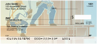 The Construction Personal Checks features a cartoon look of construction workers working on a skyscraper with their yellow helmets and tool belts on. The set includes four rotating images of the workers on the job.