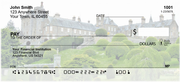 Get an idea of the European lifestyle with European Castles Topiary Gardens Personal Checks! This set includes four pictures of different castles with luscious green gardens.